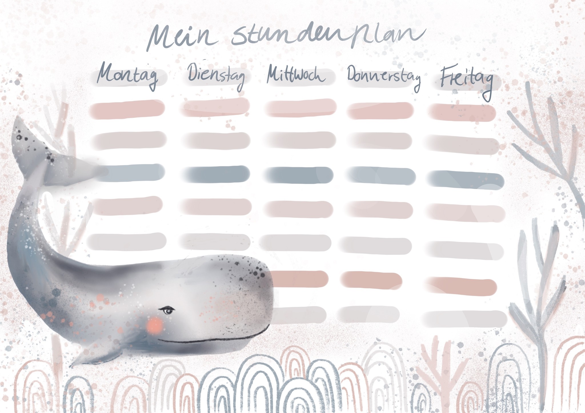 Zu den Vorbereitungen gehört bei uns auch ein Stundenplan, den die Kinder ab Klasse 2 selber bei uns ausfüllen und in die Küche ans Memoboard hängen. Dieses Jahr haben wir einen mit einem Wal, den sich mein Sohn von mir gewünscht hat. Gern würde ich ihn mit euch teilen, viel Spaß damit!